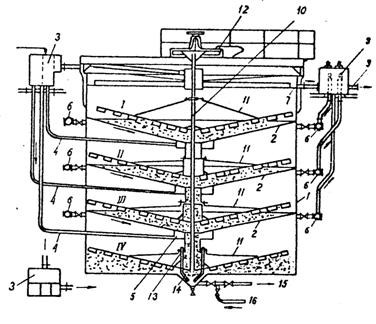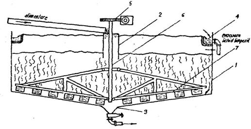 Decantorul circular cu brate este format dintr-un rezervor cilindric cu diametrul mare (1) si inaltime mica descoperit si cu fundul putin inclinat spre centru. Pe un ax ventrical central sunt fixate 2-4 brate cu racleti,actionate in miscare de rotatie de un motor electric si reductor (0,5-0,025 rot/min).