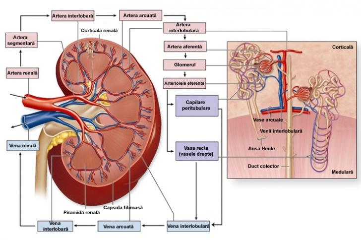 VASCULARIZATIA RENALA Este extrem de bogata, rinichii primind 20-25% din debitul cardiac de repaos. Artera renala, ramura a aortei abdominale, patrunde prin hil si apoi se imparte in ramuri interlobare (intre piramide), din care se desprind