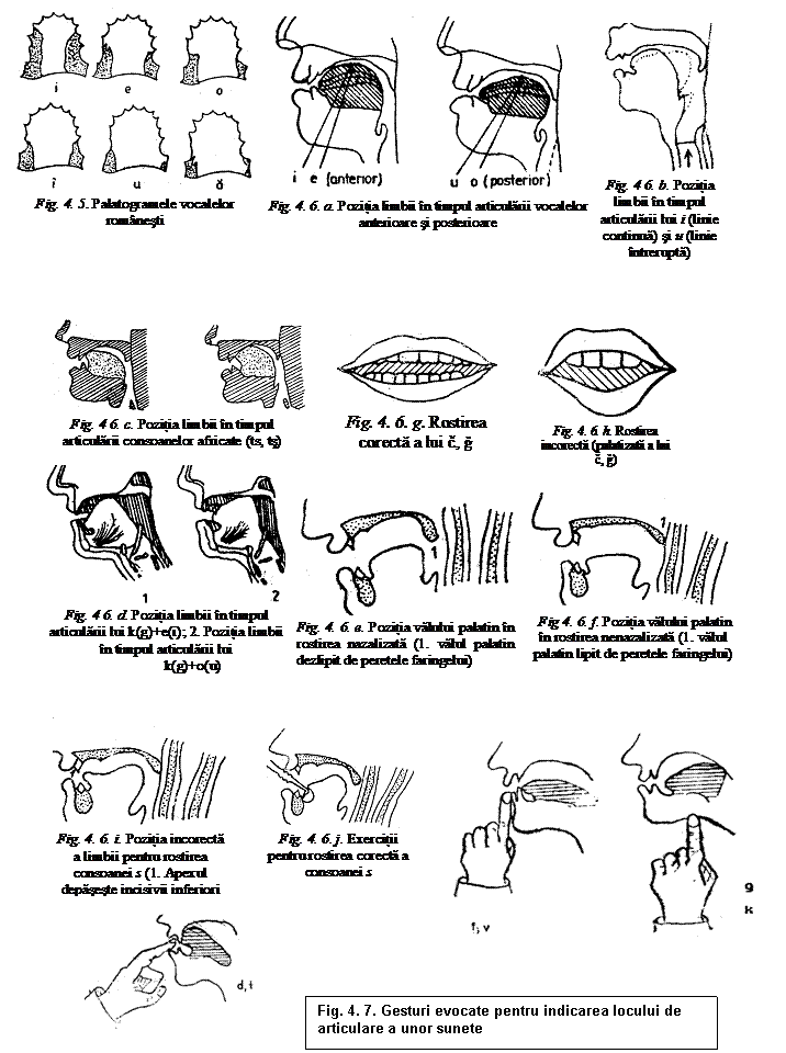 Metoda demonstratiei articulatorii. Emiterea sunetului nou se face, la inceput, numai cu concursul analizatorilor vizuali kinestezic, logopedul folosindu-se de unul din materialele sale de baza - oglinda logopedica. In fata ei, el demonstreaza copilului care este pozitia corecta a organelor articulatorii participante la elaborarea sunetului in cauza si ii explica modul de executie al miscarilor, punand un accent particular pe pozitia limbii, buzelor, dintilor si maxilarelor. In timpul demonstratiei, profesorul logoped se foloseste si de palatograme (care sunt reprezentari grafice ale suprafetei palatului atinse de limba in timpul emiterii sunetelor; pentru exemplificare, vezi fig. 5. , in care am reprodus palatogramele vocalelor romanesti) si de diferite profile de articulare, care pun in evidenta pozitia normala a organelor vorbirii in timpul pronuntarii sunetului (vezi cateva exemple in fig. 6.), in alternanta cu pozitia lor gresita. Ii sunt, de asemenea, de un real folos gesturile evocatoare, cu care il familiarizeaza pe copil, gesturi care indica locul de articulare a sunetului respectiv (ex.: in cazul sunetului s aratatorul mainii drepte va fi indreptat in jos, indicand locul de articulare a acestui sunet; pozitia degetului va fi inversa in cazul lui s, care este un sunet prepalatal). Dupa ce a urmarit atent demonstratia logopedului, copilul repera singur in fata oglinzii toate miscarile articulatorii, pana ajunge la fixarea lor kinestezica-tactila. La pronuntarea sunetului, in scopul deprinderii dislalicului cu aspectul sau acustic se trece numai dupa ce copilul a ajuns la deplina stapanire a sunetului din punct de vedere motric. Pentru aceasta, logopedul pronunta sunetul in soapta, dislalicul repeta dupa el, iar in final copilul pronunta singur, dupa modelul oferit. Totul are loc in fata oglinzii. Antrenarea analizatorului acustic in procesul complex de elaborare a sunetului este facilitata de efectuarea unor exercitii de imitare a sunetelor din natura (onomatopee). Acestea vor fi selectionate in asa fel incat intre ele si sunetul-problema al copilului dislalic sa existe o legatura directa. Exercitiile cu onomatopee - atractive si placute copiilor - joaca un rol insemnat in dezvoltarea auzului fonematic, intre care si articulatie exista o indisolubila legatura, fapt subliniat in mai multe randuri in lucrarea de fata.