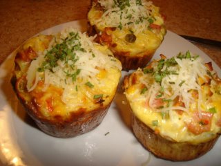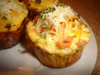 Intr-un vas batem ouale ca pt omleta, adaugam smantana si cascavalul ras (puteti lasa 2-3 linguri de cascaval si pt ornat, dar nu e musai) plus praful de copt.
