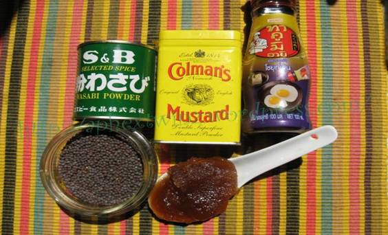 mustar (se pot inlocui cu mustar normal ambele), miere, praf de wasabi (se