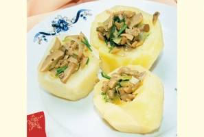 Se spala cartofii si se pun la fiert cu coaja. Se fierb numai 20 de minute, apoi se scurg de apa si se lasa la racit. Se curata de coaja si se taie in doua. In fiecare jumatate de cartof se face o scobitura cu o lingurita. Separat, se prepara umplutura. Se taie ceapa marunt si se caleste in 100ml ulei. Se adauga ciupercile taiate in feliute, sare si piper si se lasa la foc potrivit pana cand scade apa lasata de ciuperci. Se adauga apoi verdeata taiata cat mai marunt, se amesteca bine ingredientele si se umple fiecare jumatate de cartof cu aceasta compozitie obtinuta. Cartofii umpluti se asaza intr-o tava cu putina apa si cu 2 linguri de ulei. Tava se tine la cuptor, la foc potrivit, 25 de minute. Cartofii se servesc fierbinti cu mujdei preparat astfel: se piseaza bine usturoiul si se freaca cu o lingurita otet de mere. Se adauga apoi 1 - 2 linguri ulei incins si se amesteca bine cu o lingura de lemn. La sfarsit, cand ingredientele s-au omogenizat bine, se adauga apa