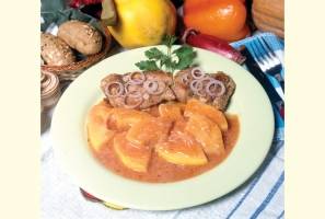 Carnea se spala, se taie bucatele si se caleste inabusit in 50ml ulei si o cescuta de apa, pana ce se evapora toata apa si bucatile de carne se rumenesc usor. Ceapa se curata, se taie julien si se caleste in uleiul ramas. Se adauga faina, bulionul si se stinge cu putina apa pentru a obtine un sos. Separat, se caramelizeaza zaharul, peste care se toarna sosul. Daca este prea gros, se dilueaza cu apa. Se da intr-un clocot, apoi se pune sosul strecurat peste carne si se lasa sa fiarba impreuna 15 - 20 de minute. Gutuile se curata de seminte, se taie felii, se asaza intr-o tava unsa cu ulei si se dau la cuptor pentru circa 30 de minute. Se pune carnea cu sos peste gutui, se potriveste de sare si se mai lasa la cuptor 20 - 30 de minute.