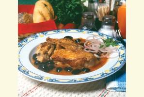 Carnea de curcan se curata, se parleste, se spala, se taie in bucati si se prajeste in ulei. Dupa prajire, carnea se scoate si se pune in alt vas. |n uleiul ramas se calesc ceapa si zarzavatul care au fost curatate, spalate si taiate marunt. Se adauga faina si se lasa sa se rumeneasca putin, apoi se stinge cu pasta de tomate dizolvata in putina apa, se adauga dafinul, cimbrul, piperul si se lasa sa fiarba circa 30 de minute. Dupa fierbere, sosul se strecoara si se pune peste carnea de curcan si se mai fierbe circa 60 de minute. Maslinele se desareaza in apa calda, se spala cu apa rece si se pun la fiert peste carne. Se adauga vinul, zaharul si se mai fierbe circa 10 de minute. Curcanul se serveste cald cu decor din rondele de lamaie.