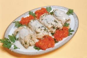 Se ruleaza fileurile, fixandu-le cu scobitori. Se pun la fiert intr-o cratita cu ceapa tocata, vinul, patrunjelul, piperul si sarea. Se lasa sa fiarba acoperit 10 minute, apoi se scot fileurile si se tin la cald, iar zeama in care au fiert se strecoara. Se incalzeste untul, amestecandu-l pe foc cu faina, fara ca aceasta sa prinda culoare. Se stinge cu zeama strecurata si se lasa sa fiarba impreuna 5 minute, amestecand mereu. Se leaga apoi sosul cu galbenusul, se amesteca cu smantana si se toarna peste rulourile tinute la cald. Se serverste pe platou sau pe farfurie si se garniseste cu rosii mici, inabusite in unt. Se scot scobitorile.