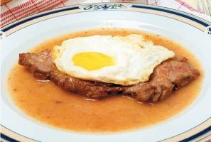 Se topesc 200g unt intr-o tigaie, se rumeneste in acesta 100g faina si se stinge cu laptele, amestecånd incontinuu, pentru a nu se forma cocoloase. Se adauga apoi småntåna, supa de oase si hreanul, curatat, spalat si dat pe razatoarea mica. Se potriveste de sare si piper si se lasa la fiert circa 20 de minute, la foc mic, apoi se pune otetul, se amesteca bine si se ia sosul de pe foc. Carnea se curata de pielite si de tendoane, se spala si se taie in 8 felii de circa 2 cm grosime. Se bat feliile de carne cu ciocanul de snitele, apoi se dau prin faina si se rumenesc cåte 3-4 minute, pe fiecare parte, in unt, dupa care se scot si se pastreaza la cald. In untul ramas se prajesc feliile de påine, apoi ouale, care se fac ochiuri. Pentru a servi acest preparat se pune pe fiecare felie de påine cåte o bucata de carne, deasupra acesteia un ou ochi si, de jur imprejur, se toarna sosul de hrean.