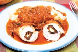 Fiecare bucata de piept se taie in doua pe lung, astfel incat sa se obtina in total patru felii de carne. Se spala, se scurg bine de apa si se sterg cu un servet de bucatarie. Apoi acestea se bat cu ciocanul de snitele pana cand isi maresc suprafata si ajung la o grosime de 5mm. Se condimenteaza cu sare si piper. Prunelor li se scot samburii, iar in locul acestora, in 8 dintre prune se pune cate o jumatate de catel de usturoi infasurat in 2-3 frunzulite de patrunjel. Prunele astfel umplute se impacheteaza in foile de carne, dupa care se prind cu scobitori. Se prajesc pachetelele in unt, la foc mic, circa 15 minute, intorcandu-le pe toate partile, apoi se scot si se pastreaza la cald. In untul ramas se pune ceapa curatata, spalata si tocata cat mai marunt, se adauga prunele ramase, tocate si ele cat mai marunt. Dupa circa 7-8 minute se adauga bulionul, boiaua de ardei, apoi dupa 1-2 minute se stinge cu supa de pui. Se pun si foaia de dafin, usturoiul ramas, tocat marunt, se potriveste de sare si piper, dupa gust si se amesteca bine. In acest sos se pun pachetelele de pui. Se acopera vasul cu un capac si se lasa sa fiarba la foc mic inca 10 minute. Cu 2-3 minute inainte de a opri focul, se pune si patrunjelul tocat marunt. Se servesc cate doua pachetele la o portie, cu garnitura de piure de cartofi si cu sosul fierbinte.