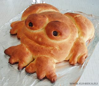 Tai fiecare broasca in parte in trei bucati si le pui la fiert 20 de minute.Amesteci faina cu ouale si le pui la cuptor la incalzit 10 minute.Iei faina si ouale si pui peste ele ciocolata si vanilia.Pui blatul peste cei doi ochi si colorezi cu tempera incat sa arate ca ochii.Iei bucatile de broasca si le pui in interiorul placintei de broaste.Bineinteles ca trebuie sa faci din acel blat ceea ce arata in poza.Dupa ce ai terminat sa unesti toate componentele pui ce ai realizat la foc o ora.