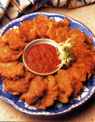 Ingrediente (pentru 18-24 bucati): 4 cepe mari, 4 catei de usturoi, 1 ceasca faina, 1 ou, 1 lingurita praf de copt, 1 lingurita praf de chili (sau boia), ulei pentru prajit. Mod de preparare: - Se curata ceapa, se taie mai intai in doua si pe urma rondele foarte fine. Usturoiul curatat se toaca marunt. - Se amesteca faina cu praful de copt si praful de chili (boiaua), se adauga apa cat cuprinde si se face un aluat cremos, in care se incorporeaza apoi ceapa si usturoiul. - Se toarna uleiul intr-o tigaie mare, cu fundul drept (stratul de ulei sa masoare 2 cm), se ia cate-o lingura din aluat si se pune in tava. Placintelele se prajesc pe ambele parti, pana ce se patrund si se rumenesc frumos. Se lasa sa se scurga pe hartie absorbanta si se servesc fierbinti, cu ketchup sau sos de chili.