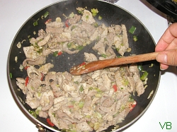 Se adauga in tigaie ardeiul si usturoiul taiat si se prajesc toate pana este gata carnea, cam inca 7 minute.