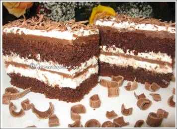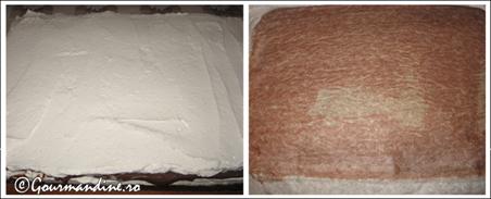 Tapetam cu hartie de copt 2 tavi identice, impartim compozitia de mai sus in doua parti egale si punem la copt, in cuptorul preincalzit, cele 2 blaturi necesare pentru prajitura. Atentie, daca nu aveti 2 tavi identice, nu-i nici o problema, impartiti compozitia in doua si coaceti blaturile pe rand. Blatul se coace in 25-30 minute, se incearca cu scobitoarea daca este copt.