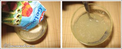 Pentru prepararea cremei, incepem prin a dizolva un plic de gelatina, intr-un pahar cu 200 ml apa.