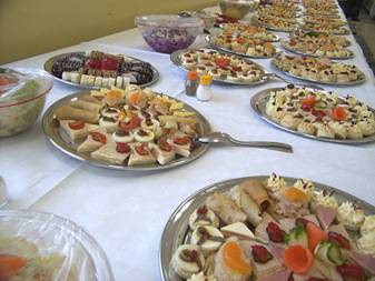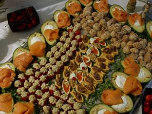 speciale : tartine (cu roastbeef, cu br. Roquefort, oua si rosii, salam de Sibiu, cu icre), cu diferite farse (ciuperci umplute, masline umplute) ;