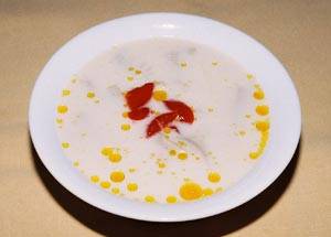 Aspect : opalescent, la suprafata crutoane de paine sau legume fierte, taiate diferit ;