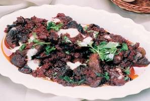 Puneti uleiul intr-o tigaie si caliti usturoiul taiat in felii mai mari, apoi scoateti usturoiul si puneti in ulei ceapa taiata marunt. Adaugati carnea taiata in bucatele potrivite si lasati-o sa se rumeneasca pe toate partile. Amestecati mereu sa nu se prinda de vas. Cand s-a rumenit uniform, turnati peste ea 150ml apa calda si adaugati mirodeniile. Lasati sa fiarba la foc cat mai mic, in vasul acoperit. Cand a scazut lichidul cam la jumatate, adaugati vinul si lasati sa fiarba in continuare cu vasul acoperit pana cand se fragezeste carnea. Cu putin inainte sa fie gata, adaugati in vas sosul de tomate in care s-a amestecat faina. Puneti si tarhonul taiat marunt si lasati sa mai fiarba la foc potrivit 15 minute. Daca sosul scade prea mult, se poate subtia cu vin alb.