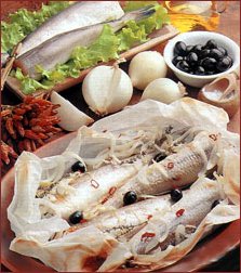 Merluciu (impachetat) la cuptor Ingrediente (pentru 4 persoane): 4 pesti a 250 g fiecare, 1 ceapa, 100 g masline negre, 1 lamaie, 1 crenguta de cimbru, 1 ardei iute (rosu) uscat, 3 linguri ulei,Citeste tot ... 201 cuvinte