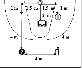 Se marcheaza sase puncte pe podea. Pentru a stabili unde anume se vor afla acestea se va lua ca punct de reper un punct aflat in fata cosului de baschet. Distantele la care se gasesc aceste puncte sunt urmatoarele:
