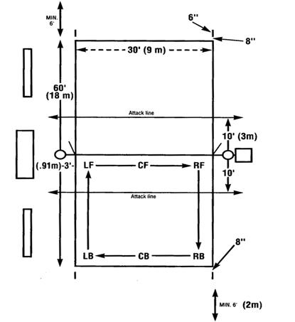 Terenul de joc este un dreptunghi masurand 18 x 9 m, inconjurat de o zona libera avand o latime de minimum 3 m pe toate laturile.