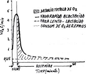 - in eforturile anaerobe alactacide se contracteaza o datorie de oxigen care se plateste la sfarsitul efortului, prin consum de oxigen marit - datorie denumita alactacida (fig. 1).