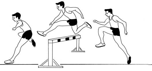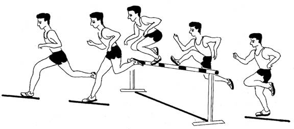-din alergare usoara, trecerea unui obstacol mobil asezat pe pista sau pe iarba, cu aterizarea din ce in ce mai lunga prin intensificarea impulsiei pe piciorul de sprijin,