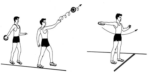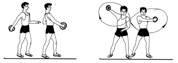 -din stand departat cu fata spre directia de aruncare cu bratul aruncator intins lateral se executa o rotatie spre inapoi apoi spre inainte urmata de aruncare,