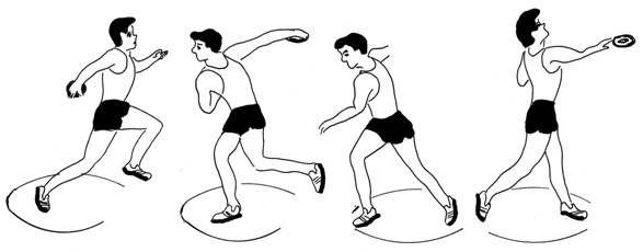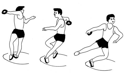 -din stand departat lateral cu spatele la directia de aruncare balansarea bratului aruncator spre inapoi intins, rasucirea trunchiului spre piciorul de impulsie cu transferul greutatii pe acesta, piciorul opus bratului de aruncare se duce pe varf iar in momentul aruncarii pe toata talpa.
