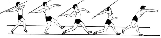-stand cu piciorul opus bratului aruncator inainte, cu fata pe directia aruncarii, sulita inapoia umarului, aruncare in jos si inainte in groapa cu nisip sau pe iarba,