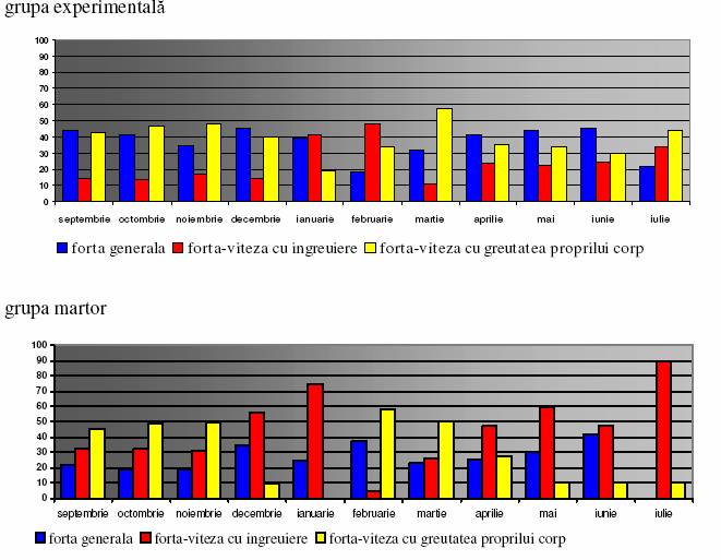 Observam ca grupa experiment a avut o structurare a pregatirii de forta-viteza care sa permita relizarea unui nivel ridicat al puterii, atunci cand este realmente nevoie de el, adica inainte de principalele competitii, conform cu recomandarile specialistilor (Bompa T.O., 2002