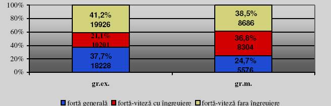 Din figura 2, in ceea ce prive(te repartizarea exercitiilor de forta-viteza in cadrul ciclului anual, reiese ca cele doua grupe implicate in cercetare au un procentaj diferit: la grupa experimentala predomina cu 41,2%-19926 repetari, exercitiile de forta-viteza fara ingreuiere, iar grupa martor inregistreaza valori apropiate ale exercitiilor de forta-viteza cu ingreuiere (36,8%-8304 repetari) si fara ingreuiere (38,5%-8686 repetari). La grupa experimentala exercitiile cu ingreuiere reprezinta 21,1%-10201 repetari, din totalul volumului mijloacelor utilizate pentru pregatirea de forta Baza pregatirii in atingerea fortei maxime- exercitiile de forta generala- au la grupa experiment un procent de 37,7%-18228 repetari, in timp ce la grupa de control acesta este de doar 24,7%-5576 repetari.