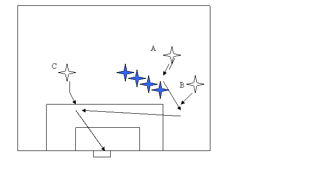 -3 jucatori A,B,C situati la 20 m de poarta: A conduce mingea, iar B si C alearga lateral ; in apropierea careului,A paseaza lui B care simuleaza sutul si lasa mingea lui C care finalizeaza.