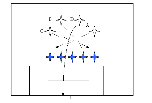 -A,B si c alearga unul dupa celalalt, cu intentia de a executa lovitura urmarind insa dezorganizarea zidului si crearea unuei pozitii favorabile pentru adevaratul suteur jucatorul D.