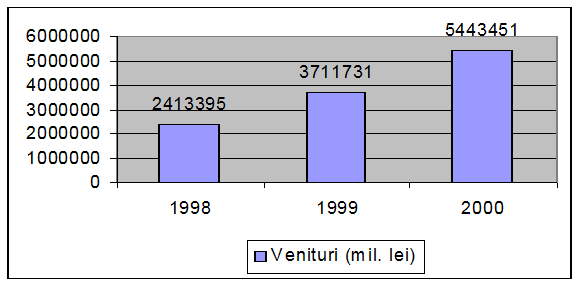 Analizand datele prezentate in tabelul nr. 1.4.4. se observa ca modificarea absoluta a veniturilor inregistreaza numai cresteri in perioada luata in calcul. Astfel, veniturile totale ale societatii cresc in anul 1999 fata de anul 1998 cu 1.298.336 mil. lei si, respectiv, o crestere absoluta cu 1.731.720 mil. lei in anul 2000 fata de anul 1999, procentual aceasta insemnand o crestere de 46,65%.