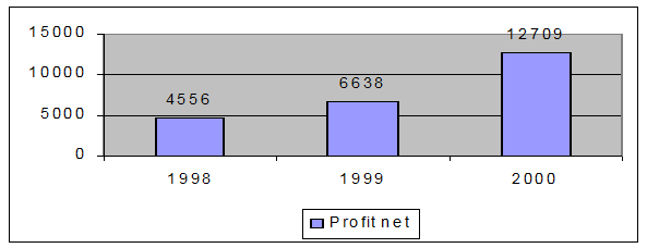 Asa cum se observa din figura 4, profitul net al S.C. Oltchim S.A. inregistreaza cresteri in perioada analizata. Astfel, profitul creste cu 2.082 mil. lei in anul 1999 fata de 1998 (45,69%), iar in anul 2000 se inregistreaza o dublare a profitului obtinut in 1999, de la 6.638 mil. lei la 12.709 mil. lei (91,45%). Aceasta situatie se apreciaza favorabila pentru firma si se explica prin faptul ca veniturile cresc mai rapid, devansand cheltuielile.