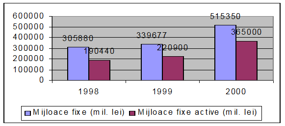 Activele fixe direct productive inregistreaza cresteri mai mari decat cele fixe, in anul 2000 fata de 1999 cresterea fiind de 65,23% (tabel nr. 1.4.5.).