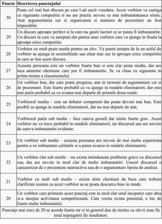 In plus, fiecare vorbitor va primi un punctaj pentru prestatia sa, dintr-un maxim de 30 de puncte. Acordarea acestor puncte se poate face luand in calcul urmatoarele elemente: