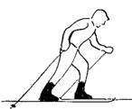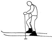 schiurilor pe zapada cu vârfurile divergente, cu schiul de împingere pe muchia interioara, celalalt pe toata talpa. Greutatea este trecuta de pe un schi pe celalalt prin proiectia corpului spre schiul descarcat, cu centrul de greutate înaintea poligonului de sprijin. Împingerea necesara înaintarii se realizeaza prin miscari de flexie-extensie a piciorului de sprijin, care poate fi asociata si cu actiunea de împingere cu ambele bete.