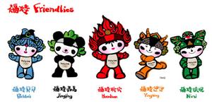 Fiecare mascota are numele compus din doua silabe ritmate, o maniera traditionala de a se exprima afectiunea fata de copii: BEIBEI - reprezinta un pestele (are culoarea albastra si simbolizeaza sporturile acvatice), JINGJING - reprezinta un urs panda (are culoarea neagra si simbolizeaza sporturile de lupta), HUANHUAN - reprezinta flacara olimpica (are culoarea rosie si simbolizeaza sporturile cu mingea), YINGYING - reprezinta o antilopa (are culoarea galbena si simbolizeaza atletismul), NINI - reprezinta o randunica (are culoarea verde si simbolizeaza gratia gimnastelor).
