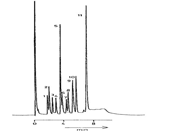 In tabelul 6 sunt prezentate substantele detectate, impreuna cu timpii de retentie (tR) si timpii de retentie relativi (tRR) in ordinea de elutie cromatografica. Ca standard intern s-a utilizat diizopropilaminododecanul, DIPA 12 functie de care s-au calculat timpii de retentie relativi (tRR)[20].