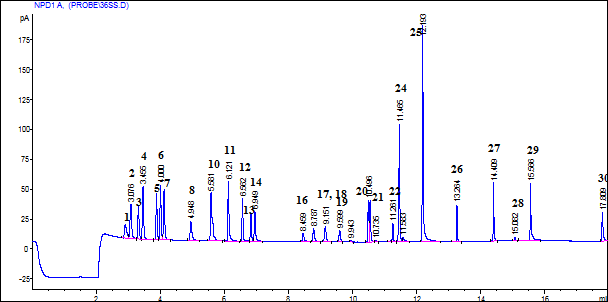 Cromatograma pentru un amestec etalon obtinut prin analiza screening GC-NPD a unui amestec etalon de stimulente volatile este prezentata in figura 16[20].